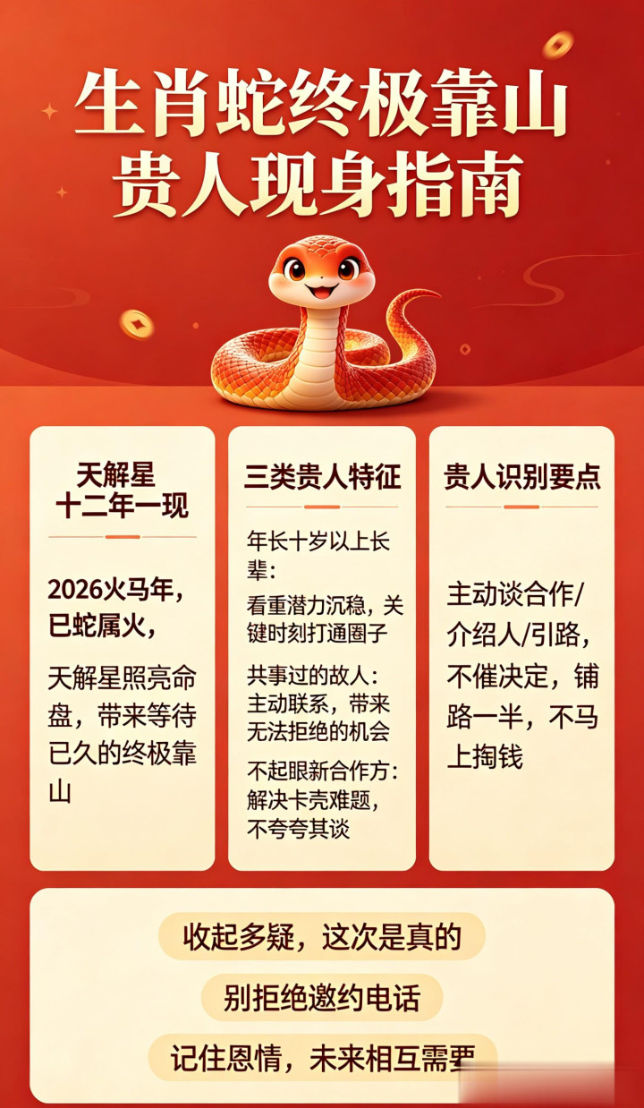 而2026年这个时间点很特殊。火马之年,巳蛇属火,火火相旺,你的能量本就空前高涨。但真正让你“富贵无边”的,不是你自己有多拼,而是那个愿意把资源直接递到你手里的人。